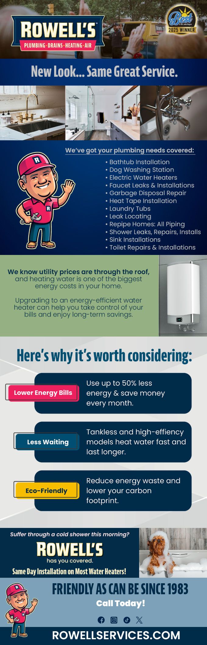 "Friendly As Can Be Since 1983!" When you need help with your plumbing, drains, heating, cooling or electrical in Hebron, you can always rely on Rowell's Services! Call us now or book online!