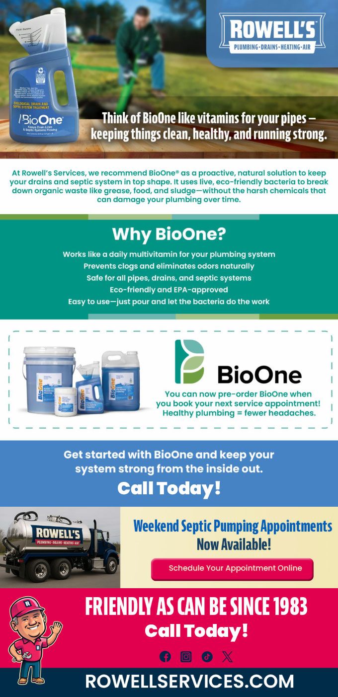 At Rowell's Services, we recommend BioOne® as a proactive, natural solution to keep your drains and septic system in top shape. It uses live, eco-friendly bacteria to break down organic waste like grease, food, and sludge—without the harsh chemicals that can damage your plumbing over time.