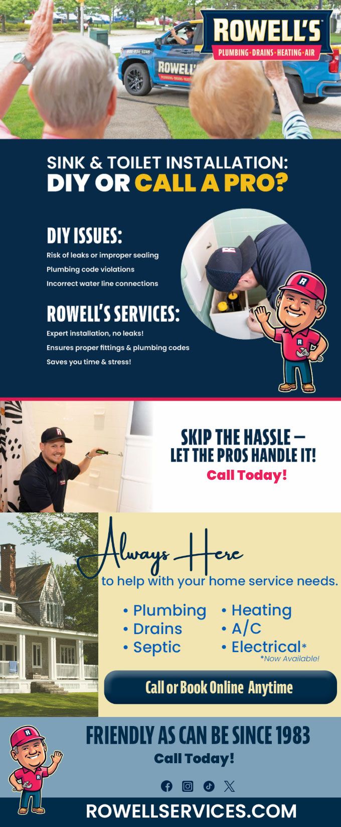 "Friendly As Can Be Since 1983!" When you need help with your plumbing, drains, heating, cooling or electrical in Hebron, you can always rely on Rowell's Services! Call us now or book online!